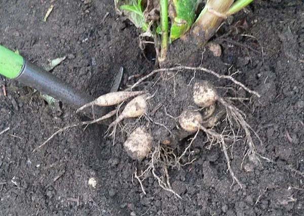 Important! Si vous placez une pelle ou une fourche trop près du buisson, vous pouvez endommager les tubercules. ils vont sur les côtés.