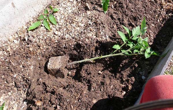 Remarque! Les semis envahis doit être atterri horizontalement (allongé, quelque part à un angle de 30 degrés par rapport au sol) dans une rainure ou une tranchée, puis creusez une partie de la tige allongée à partir de laquelle vous avez précédemment coupé toutes les feuilles. Il est important que toutes les plantes soient plantées avec la même direction des racines et des tiges... La tomate elle-même à l'avenir se redressera et commencera à pousser vers le haut, et non sur le côté, par conséquent, vous n'avez pas besoin de la plier exprès, sinon vous la casserez simplement.