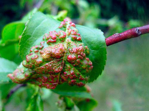 - Tout d'abord, les jeunes feuilles fraîchement épanouies sont touchées, sur la face avant desquelles taches bosselées orange ou rose rougeâtre (leur surface devient inégale et ondulée).