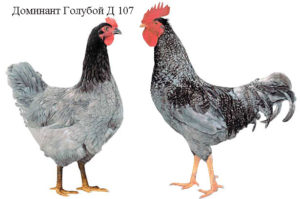 En couleur, cette variété ressemble le plus aux oiseaux de la race andalouse. Selon les experts, les poulets bleus dominants D107 se distinguent par une bonne adaptation aux conditions climatiques caractéristiques du lieu de leur élevage. La coquille des œufs a des nuances distinctes de brun.