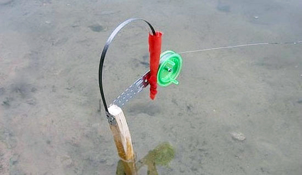 - Avec bobine - est constructivement le même zherlitsa d'hiver. Pour ce faire, un ressort avec un drapeau en tissu rouge vif ou vert clair est vissé sur les vis autotaraudeuses au sommet d'un long bâton, un support avec une bobine est fixé juste en dessous. L'extrémité du bâton est affûtée. Le gréement est utilisé de la même manière que dans la conception précédente, à la différence que le montant de la ligne principale peut être augmenté à 10-15 mètres. Ils attrapent ce matériel de la manière suivante - ils appâtent les alevins sur les hameçons, jettent le gréement dans l'eau de la main, selon le principe de l'âne; la poutre est coincée avec une extrémité pointue dans le sol de la rive; la bobine est utilisée pour tendre la ligne. Un ressort avec un drapeau est enroulé à l'intérieur de la rainure de bobine. Lorsqu'il mord, la bobine tourne et le ressort, lorsqu'il est relâché, se redresse, signalant au pêcheur la capture du prédateur.