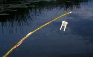 - Équipement de moulage - le matériel appâté est attaché à une perche, à un arbre ou à un piquet enfoncé dans le rivage et soigneusement jeté à l'eau. Pour la pêche sur une petite rivière ou un étang, 3-4 poutres suffisent amplement - ce montant est largement suffisant pour attraper 3-4 brochets avec une activité normale du prédateur. Un grand nombre de galles sont non seulement illégales, mais également incommodes.