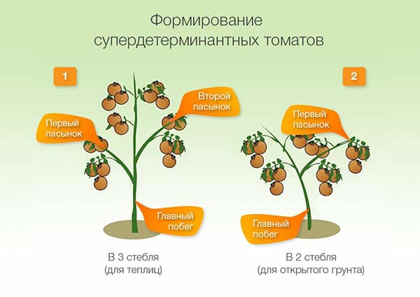 Les variétés superdéterminantes limitent leur croissance pour la plupart immédiatement après la formation du premier pinceau à fleurs, et toutes les variétés suivantes apparaissent dans les étapes-fils et, par conséquent, les étapes-étapes ne peuvent être supprimées que jusqu'au premier pinceau à fleurs (généralement il n'y en a que 2-3 avant).