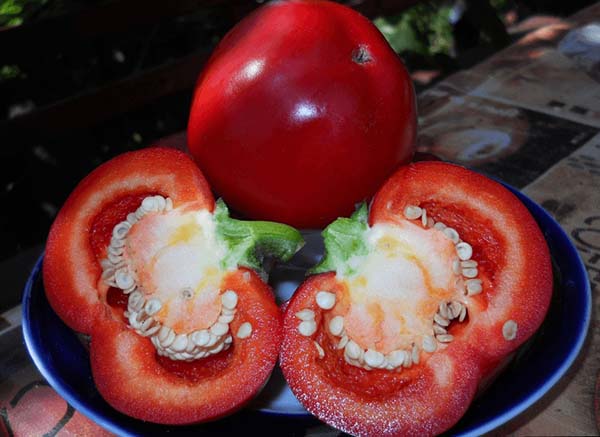 - Le fruit est tombant, conique, très brillant, la couleur est verte en maturité technique, en maturité biologique - rouge. Le nombre de nids est de 3-4. Longueur du fruit - 18-20 cm, diamètre - 13-14 cm.