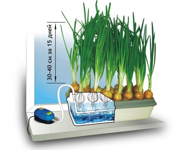 Idée intéressante! Si vous prenez un récipient, remplissez-le d'eau, coupez-y des trous pour les oignons, puis connectez-le compresseur de l'aquarium (installation hydroponique), puis en raison de l'enrichissement de l'eau en oxygène, les oignons pousseront nettement plus rapidement.