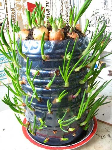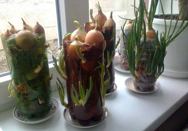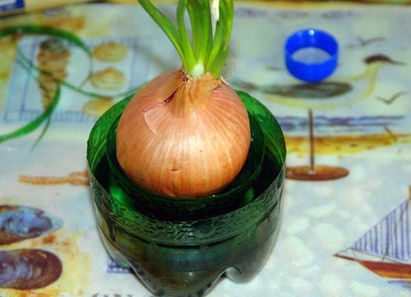 L'une des façons les plus originales de faire pousser des oignons en appartement est de les planter dans une bouteille en plastique (5-6 litres).