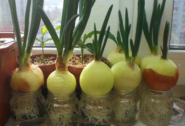 Un moyen facile de faire pousser des oignons sur un rebord de fenêtre est d'enraciner les têtes dans l'eau.