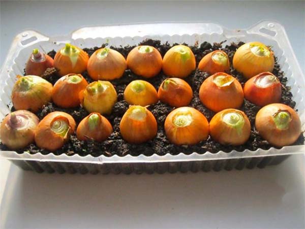 Conseil! Obtenez des plumes fraîches tout au long de l'hiver il est possible de planter constamment des bulbes frais, par exemple en plantant deux bulbes dans le même récipient tous les 3-4 jours. Ensuite, vous aurez une sorte de "slide".