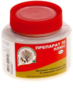 - Préparation 30 plus (Huile de vaseline, insecte de contact-acaricide dès les stades d'hivernage des ravageurs - cochenilles, pseudo-cochenilles, tiques, pucerons, gaules, papillons de nuit, cochenilles; pulvériser pendant la dormance - avant le débourrement, au début du printemps).