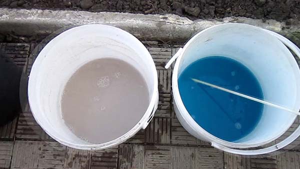 Vous pouvez acheter de la bouillie bordelaise prête à l'emploi soit préparez vous-même la solution (alors le liquide bordelais sera appelé)... Par exemple, pour une solution à 3%, vous devez prendre 300 grammes de sulfate de cuivre et 400 à 450 grammes de chaux. Le sulfate de cuivre est dissous dans 5 litres d'eau chaude, puis la chaux est dissoute dans un seau séparé (5 litres). De plus, en un mince filet, sous agitation constante, du vitriol est versé dans la solution de chaux.