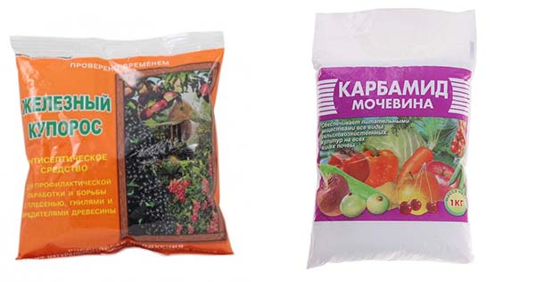Important! Vous pouvez appliquer de l'urée et du sulfate ferreux en même temps, en préparant une sorte de mélange en réservoir. C'est, par exemple, dissoudre 200 grammes d'urée et 200 grammes de sulfate ferreux dans 10 litres d'eau. L'urée fonctionnera sûrement contre les larves d'insectes nuisibles.