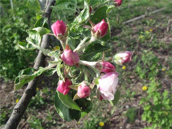 La troisième étape de traitement des pommiers au printemps contre les maladies et les ravageurs est effectuée au stade où le bourgeon est déjà formé et avancé (il est rose), mais ne s'est pas encore ouvert.