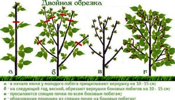 Remarque! Vous auriez dû pincer les sommets des jeunes pousses pour la première fois l'année dernière, afin que ces pousses donnent des pousses latérales à l'automne (sur lesquelles la future récolte se formera principalement). Et dès le printemps prochain, vous devez raccourcir ces pousses latérales particulières afin de provoquer leur plus grande ramification - pour augmenter encore le rendement. En général, c'est la signification de la double taille de Sobolev, dont l'essence est décrite dans la section suivante.