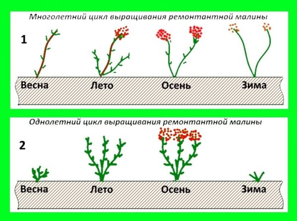 Remarque! Dans les conditions de la bande centrale (région de Moscou), il vaut mieux couper complètement les framboises remontantes (pour obtenir 1 bonne récolte en août-septembre). Mais dans le sud et dans les régions avec une période chaude plus longue, les pousses annuelles peuvent et mieux encore être laissées pour obtenir 2 récoltes complètes.