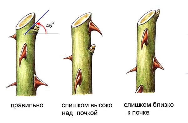 Remarque! La coupe doit être oblique pour que l'humidité ne s'accumule pas. De plus, il doit être légèrement plus haut que le rein d'environ 0,5 à 1 cm. Ce dernier rein doit être externede sorte que l'année prochaine, la brindille ira à l'extérieur, et non à l'intérieur de la brousse.