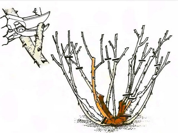 - Les pousses sont coupées à 0,5 cm au-dessus du bourgeon gonflé sain, dirigées depuis le milieu du buisson, afin d'éviter une croissance dense au centre de la plante. Les pousses d'un an retiennent jusqu'à 5 bourgeons. Sur les troncs adultes, plusieurs branches latérales saines avec 2-3 bourgeons sur chacune sont conservées. Assurez-vous de faire attention à la force des pousses: chez les affaiblis, 1 bourgeon est conservé, chez les forts - 3-5 bourgeons.