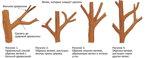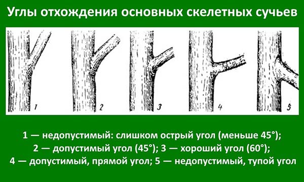 - Absolument pas nécessaire branches poussant à un angle très aigu (c.-à-d. l'angle de départ est inférieur à 40-45 degrés) et formant des «fourches», ils sont également découpés (en raison de la charge de fruits, la branche peut se fissurer).