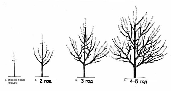 La taille d'un pommier par année en automne ou au printemps est effectuée comme suit (formation à plusieurs niveaux):