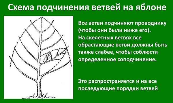Remarque! Il est très important d'observer le principe de subordination des branches, c'est-à-dire que toutes les branches latérales (branches squelettiques) obéissent au guide (tronc central) et ne doivent pas être plus hautes. Cela s'applique également à la croissance sur les branches squelettiques.