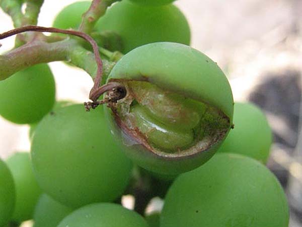 Déjà après la floraison, lorsque les fruits ont pris et qu'ils commencent à mûrir, un signe caractéristique de la présence d'oïdium sur les raisins est le fait que les baies vertes sont craquelées (auparavant elles sont également recouvertes d'une fleur blanche). Par là vers l'extérieur tous leurs intérieurs sont retournés (graines)qui commence presque instantanément pourrir ou se dessécher (selon le temps)être affecté par diverses bactéries et champignons (par exemple, moisissure grise), tout en mettant en évidence la caractéristique l'odeur de poisson manquant (hareng rouillé ou pourri).