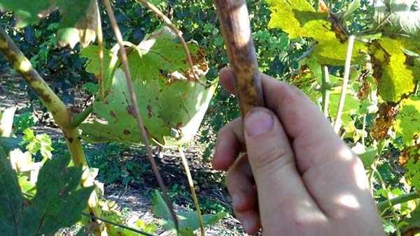 Des taches sombres qui noircissent très rapidement apparaissent sur les pousses. Une telle vigne ne mûrit pas longtemps et gèle très facilement en hiver.