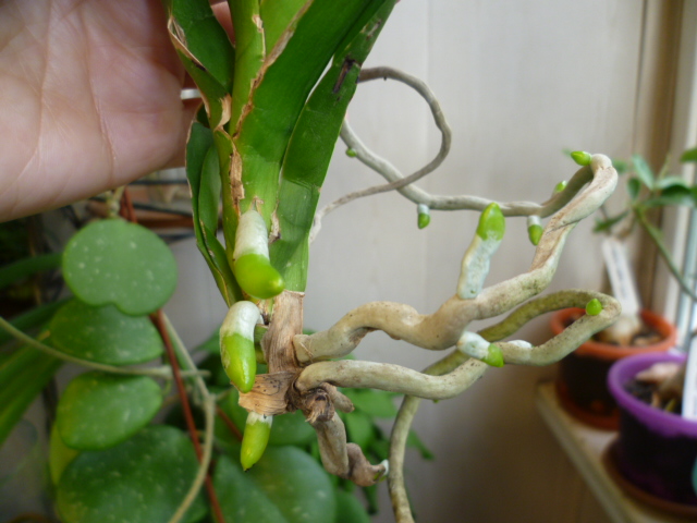 - système racinaire puissant de couleur verte avec une floraison grise, absorbant l'humidité non seulement du tronc des arbres et de l'herbe, mais aussi de l'air;