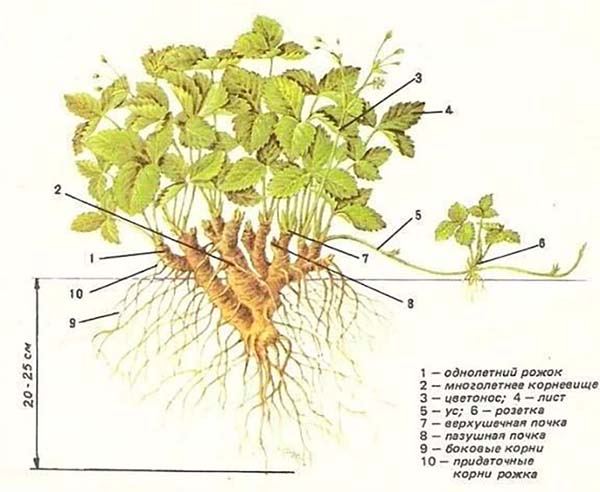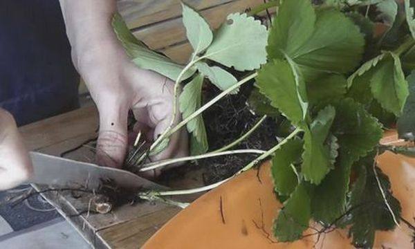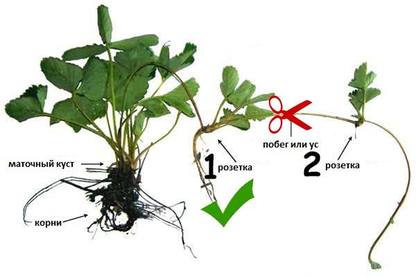 - Toutes les autres cornes (non séparées indépendamment) doivent être coupées de la plante mère avec un couteau, alors qu'il est important que chaque corne ait un bourgeon apical et des racines (voir le schéma du vieux fraisier dans le premier paragraphe de l'article).