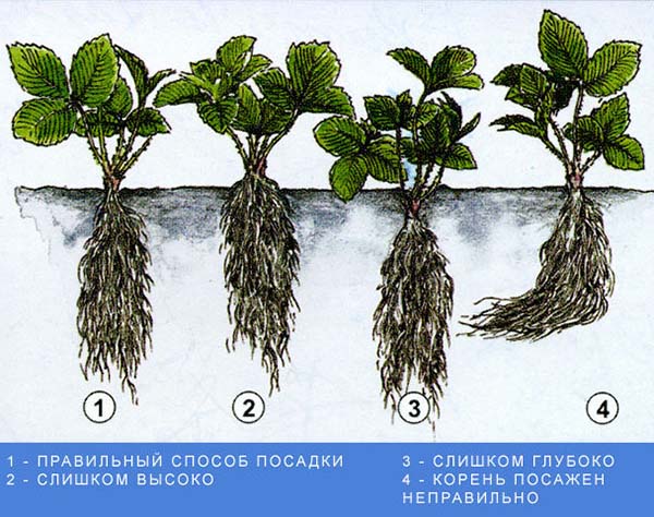 Important! Les fraises ne doivent pas être plantées pendant la chaleur estivale, car les racines ne peuvent pas encore recevoir correctement la nutrition du sol et l'air chaud fait évaporer fortement l'humidité des feuilles. En conséquence, ces buissons prendront racine pendant très longtemps et douloureusement, ou se dessècheront (sans soins appropriés).