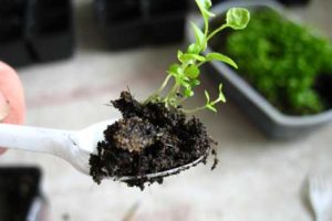 - Transférer les grappes dans les trous, approfondir jusqu'aux cotylédons et appuyer doucement avec la même cuillère (bâton), puis pousser légèrement (presser) la terre des bords du récipient.