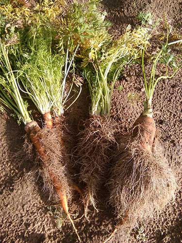 - à cause de manque d'humidité (été sec) pendant la période de croissance active de la culture des racines, les carottes ont commencé à jeter des racines supplémentaires pour une meilleure extraction de l'humidité du sol.