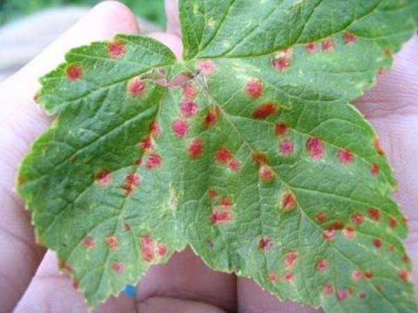 Avec une telle maladie, les feuilles apparaissent petites taches (comme des points) rouge brunâtre... Dans ce cas, vous devez dépenser pulvérisation de groseilles avec une préparation fongicide (veux dire contre les maladies).