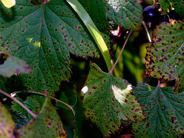 Le principal symptôme de la maladie de l'anthracnose du cassis est la formation sur les feuilles petites taches rondes de couleur brun foncé (rouge), sur lesquels apparaissent alors des tubercules noirs brillants (sporulation conidienne du champignon). Et avec un fort développement de la maladie les taches fusionnent, les feuilles deviennent brunes, sécher, leurs assiettes sont enroulées à l'envers. Ils sont prématurés tomber et ne restent qu'aux extrémités des pousses en croissance.