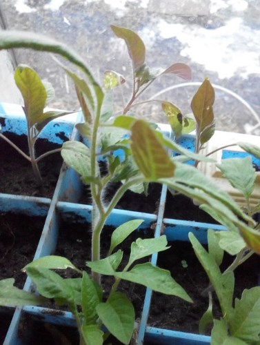 Très souvent, les plants sont cultivés sur un rebord de fenêtre, où il fait très froid, surtout si les cadres sont vieux et en bois, et tirent à froid des fissures. Voici les plants de tomates et virent au violet.