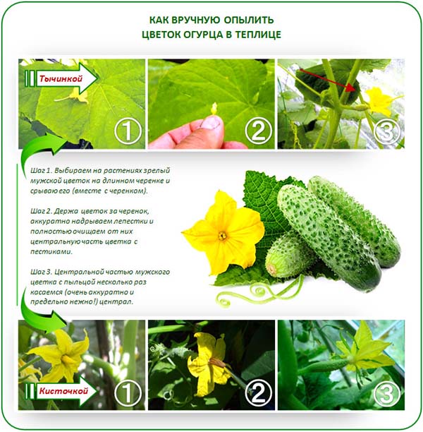 Le processus de pollinisation des concombres de vos propres mains est montré sur l'image: