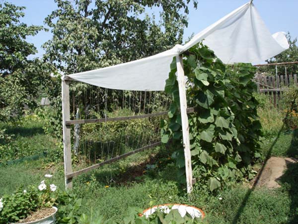 Si la température dans la serre vous pouvez encore en quelque sorte ajuster, par exemple, aérer en ouvrant la porte la nuit, puis dans terrain ouvert tu n'as qu'à faire auvent spécial... Par conséquent, il est également nécessaire dans un premier temps de décider du meilleur endroit (ombre partielle légère) pour semis direct de graines dans le sol ou planter des plants de concombres.