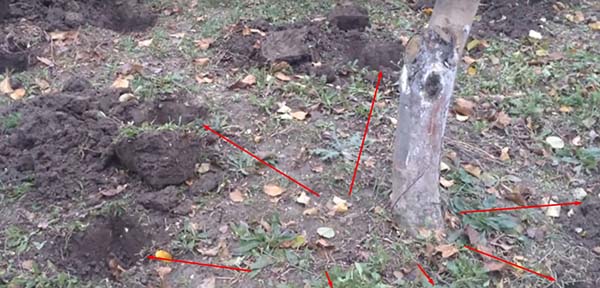 Lorsque vous faites de la vinaigrette, l'engrais doit être appliqué pas sous le canon, mais forcément partant de l'arbre de 50 à 70 cm et plus... C'est à cette distance que se trouvent les racines de l'arbre que vous souhaitez nourrir. Dans le même temps, il est plus rationnel d'enterrer les engrais dans le sol à petites doses, ou simplement de les disperser le long de la projection (périmètre) de la couronne, puis de déterrer une pelle 1/2 baïonnette (10-15 centimètres).