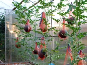 Ainsi, lorsque la taille des fruits atteint environ la taille d'une balle de tennis, il est recommandé de les suspendre dans un filet à un treillis horizontal, car il y a un risque de rupture de la tige.