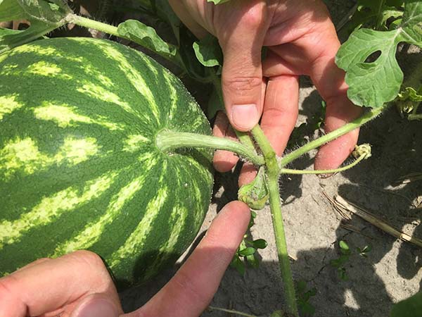 Il est très facile de déterminer que la pastèque est mûre et prête pour la récolte. Près de chaque pastèque, il y a une vrille et une omoplate (petite feuille), quand elles sèchent, il est temps de récolter (couper) la récolte.