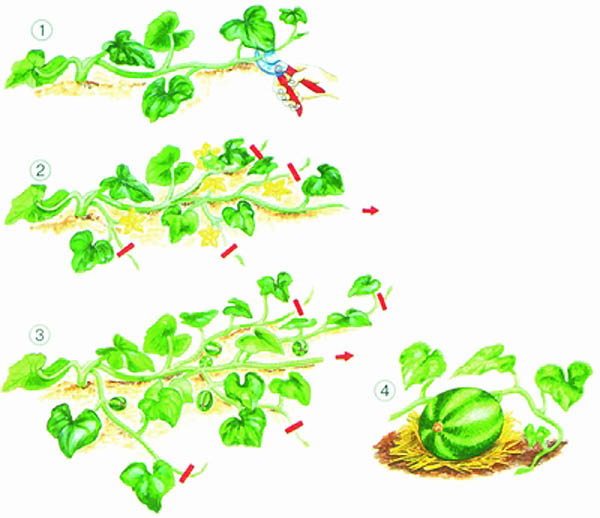 Si vous souhaitez obtenir une récolte de gros fruits, accélérer leur maturation et améliorer le goût, les pastèques doivent être pincées (façonnées).