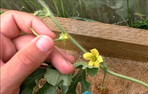 En cas de pollinisation insuffisante due à l'absence d'insectes et à un temps nuageux défavorable (la température optimale est de +20 .. + 35 degrés), la procédure pollinisation des pastèques il est souhaitable de tenir manuellement, touchant les étamines des fleurs mâles aux pistils femelles (ils ont de petites pastèques à la base)