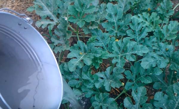 La pastèque doit être arrosée très abondamment et rarement. Et pas seulement à la racine, mais sur toute la surface consacrée au melon (selon votre schéma de plantation, par exemple, 100 sur 60 cm ou 90 sur 50 cm). Où l'eau doit être chaude: le froid peut provoquer une oppression de la plante et une mauvaise pollinisation.