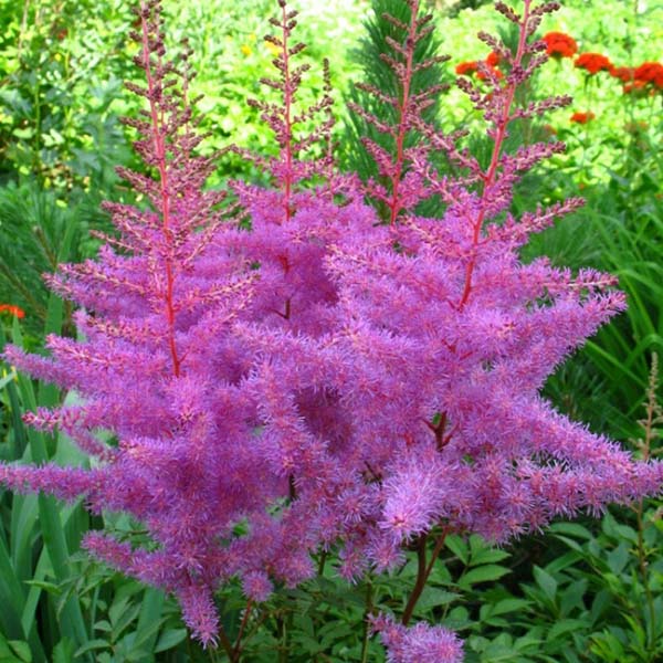 En ce qui concerne le choix de la hauteur de l'astilbe, alors si vous souhaitez planter un arbuste à l'arrière-plan d'un parterre de fleurs ou d'une clôture, il est préférable de choisir une variété plus élevée. Par exemple, la variété Améthyste Est le choix parfait.