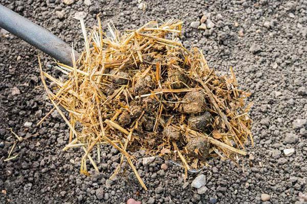 - Ensuite, remplissez tout le trou jusqu'au sommet (au moins 20 cm, ou mieux - 25 cm) avec du fumier frais avec de la paille, le soi-disant fumier de paille (le fumier propre doit être de 20%, la paille - 80%). Ce sera une sorte de couche de paillage qui retiendra l'humidité, empêchera les racines de surchauffer en été chaud, et jouera également le rôle d'un excellent abri d'hiver.