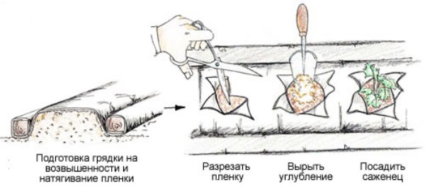 Un lit de fraises pré-préparé est recouvert d'un film noir d'une densité de 60 g / m2. Lors de l'utilisation de plusieurs coupes, elles sont posées avec un chevauchement de 15 à 20 cm.Les extrémités du matériau sont appliquées avec des briques et la partie centrale est fixée au sol à l'aide de crochets en fil. Les trous sont coupés en agrofibre pour planter des fraises à une distance correspondant au modèle de plantation choisi.