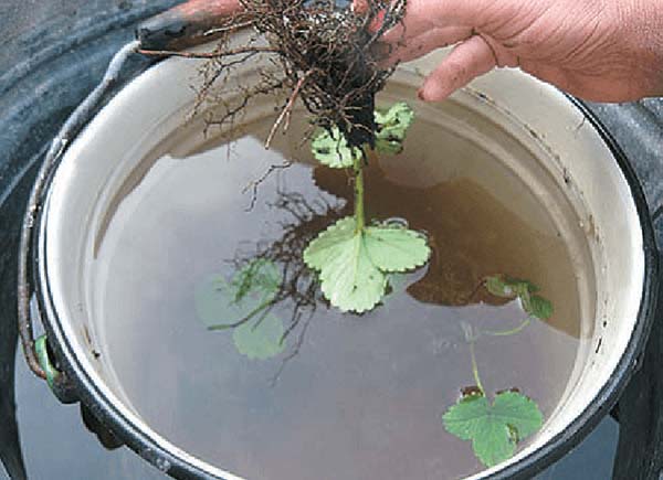 Au fait! De nombreux jardiniers conseillent les plants de fraises avant la plantation. tremper 10-15 minutes dans l'eau chaude (60-65 degrés). Cette procédure aidera se débarrasser des tiquesqui pourrait se cacher sur les semis (feuilles). Alternativement, ils peuvent être pulvérisés avec Fitoverm ou un acaricide similaire, tel qu'Actellik.