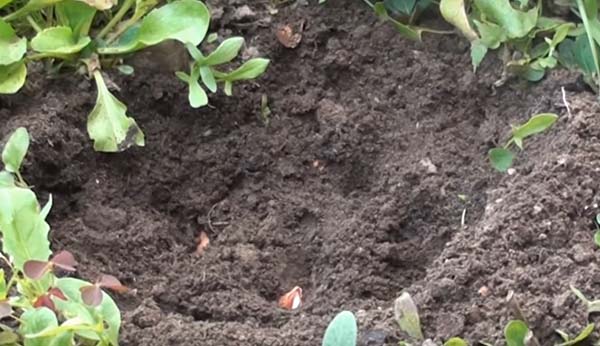 - Placez les ampoules au fond du trou et enfoncez-les légèrement dans le sol (ou dans le sable).