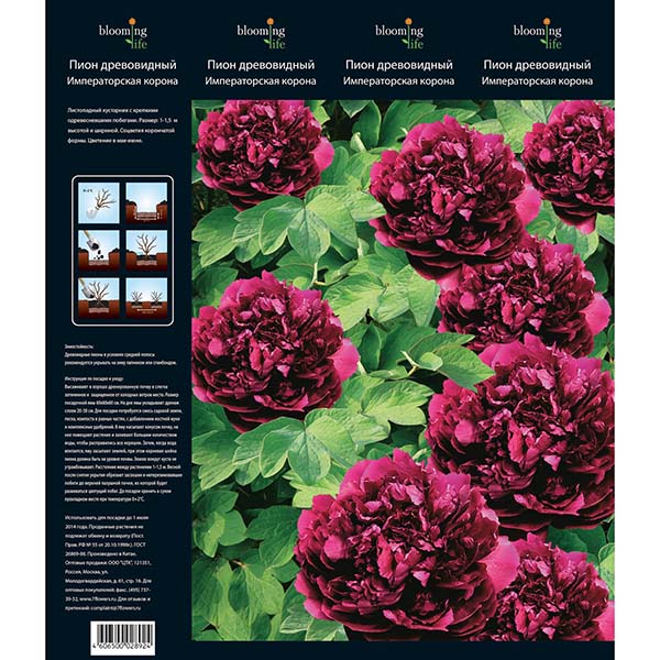 L'emballage lui-même peut aider à choisir un bon plant de pivoine, car, en règle générale, le nom de la variété elle-même et sa brève description y sont mis en évidence, ainsi que le nombre de divisions pour la plantation est indiqué, il y a une marque sur le contrôle de qualité. Bien sûr, vous ne pouvez pas négliger les instructions de mini-plantation, qui sont imprimées au dos de la boîte.