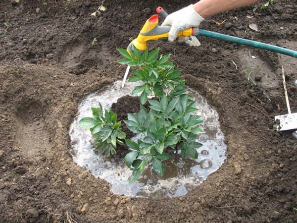 Dans les premiers jours après la plantation, les pivoines doivent être arrosées quotidiennement pour un enracinement plus réussi.