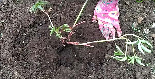 - Maintenant, vous devez couvrir les racines de la pivoine avec de la terre et la compacter un peu avec vos mains, mais pas avec vos pieds.