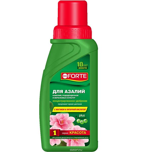 Concernant tels pansements, il est conseillé de faire 2-3 pansements avec des engrais acides pendant l'été. Parfait pour ça engrais prêts à l'emploi pour azalées, rhododendrons et autres bruyères.